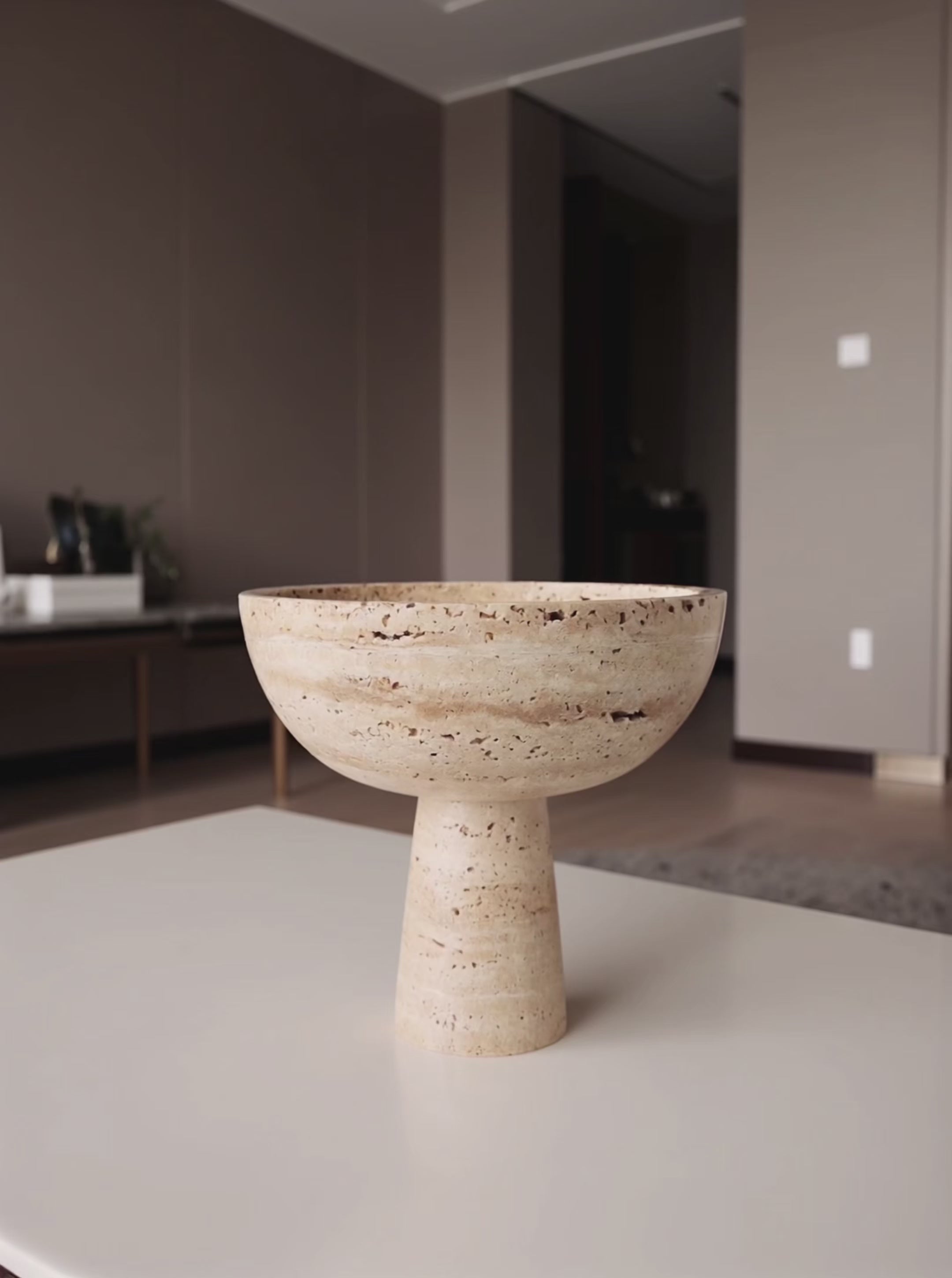Diese handgefertigte Schale aus hochwertigem elfenbeinfarbenem Travertin verfügt über eine abgerundete Schalenform und einen stabilen Fuß, was ihr sowohl Eleganz als auch Funktionalität verleiht. Die großzügige Fläche eignet sich ideal zum Servieren von Obst oder anderen Speisen. Das natürliche Muster und die Textur des Travertins verleihen jeder Schüssel ein einzigartiges Aussehen, während der robuste Stein für lange Haltbarkeit und Vielseitigkeit sorgt. Eine perfekte Kombination aus praktischem Nutzen und handwerklicher Qualität.